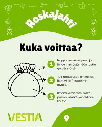 Roskajahti kannustaa kaikkia kuntalaisia osallistumaan ympäristön siistimiseen. Kampanjan aikana kerätyt roskapussit voi toimittaa Roskajahti-lavalle tai omaan jäteastiaan.
