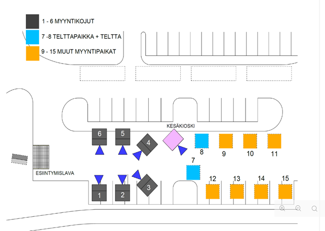 Torilla on käytettävissä kuusi myyntikojua ja kaksi kunnan tarjoamaa telttapaikkaa telttoineen. Myyjät voivat halutessaan tuoda myös omat kalusteensa paikoille, jotka ovat etukäteen varanneet. Kaikki myyntipaikat ovat maksuttomia, mutta sähköä ei kojuihin tai telttapaikoille voida järjestää.