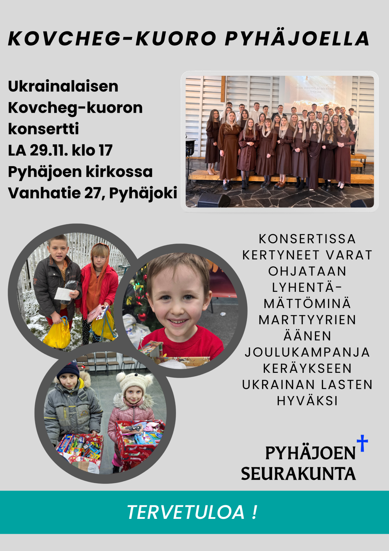 Pyhäjoella tapahtuu YleisötapahtumatAnnalan Joulu28.11.2025 - 18:00 Annalan museo, Annalantie 20, 86100 Pyhäjoki Muut tapahtumatTyökalujen huoltotyöpaja29.11.2025 - 12:00 Pyhäjoen Kulmahuone MusiikkiKovcheg-kuoro Pyhäjoen kirkossa29.11.2025 - 17:00 Pyhäjoen kirkko YleisötapahtumatHauksuonnevan tuulivoimahankkeen infotapahtuma02.12.2025 - 15:00 Pirttikosken kylätalo, Pirttikoskentie 585 Tapahtumakalenteri