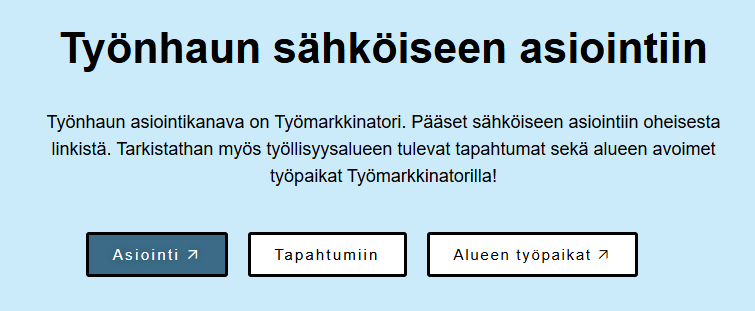 Työnhaun sähköinen asiointikanava on nimeltään Työmarkkinatori. Linkit palveluihin ovat Raahen työllisyysalueen aloitussivulla. Katso kuva alla.