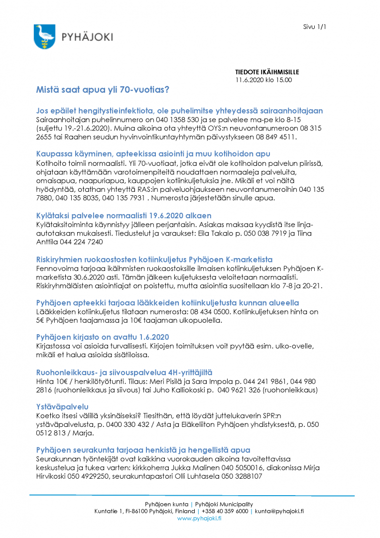 Pyhäjoella soitetaan yli 70-vuotiaille asukkaille29.04.2020 Tilanne 11.6.2020: Senioreille soittelu jatkuu edelleen. Parhaillaan tavoittelemme 70-74 -vuotiaita pyhäjokisia. Voitte ottaa myös yhteyttä meihin, mikäli herää huoli omasta tai läheisen vanhuksen pärjäämisestä tai palvelutarpeiden muutoksesta. Tiedote 11.6.2020: Ajankohtaista Pyhäjoelta Tuen hakuaika päättyi – 17 hakemusta vuoden 2026 tapahtumiin08.12.2025 Pyhäjoen kunnan osallistuvan budjetoinnin haku vuoden 2026 tapahtumien tukemiseksi päättyi 5.12.2025 klo 15.00. Määräaikaan mennessä saapui yhteensä 17... Vastaa liikuntakyselyyn - kehitetään liikuntatoimea yhdessä05.12.2025 Auta kehittämään liikuntatoimea ja vastaa kyselyyn alla olevasta linkistä. Haluaisitko kokeilla jotain lajia, onko tarjontaa riittävästi vai haluaisitko... Varaa liikuntatilat ennen joulua29.11.2025 Hyvät kuntalaiset ja joululomalaiset! Varaattehan joululoman ajaksi (20.12.– 2. 1) kaikki liikuntapalvelut viimeistään perjantaina 19.12. klo 15 mennessä:... Pyhäjoen Joulutunnelman 27 kohdetta kutsuu kierrokselle28.11.2025 Pyhäjokiset ovat jälleen koristelleet jouluisiksi portinpieliä, ikkunoita, joulukuusia ja jopa vanhan sotilasajoneuvon. Koristeltuja kohteita voi tutkia... Kaikki ajankohtaiset