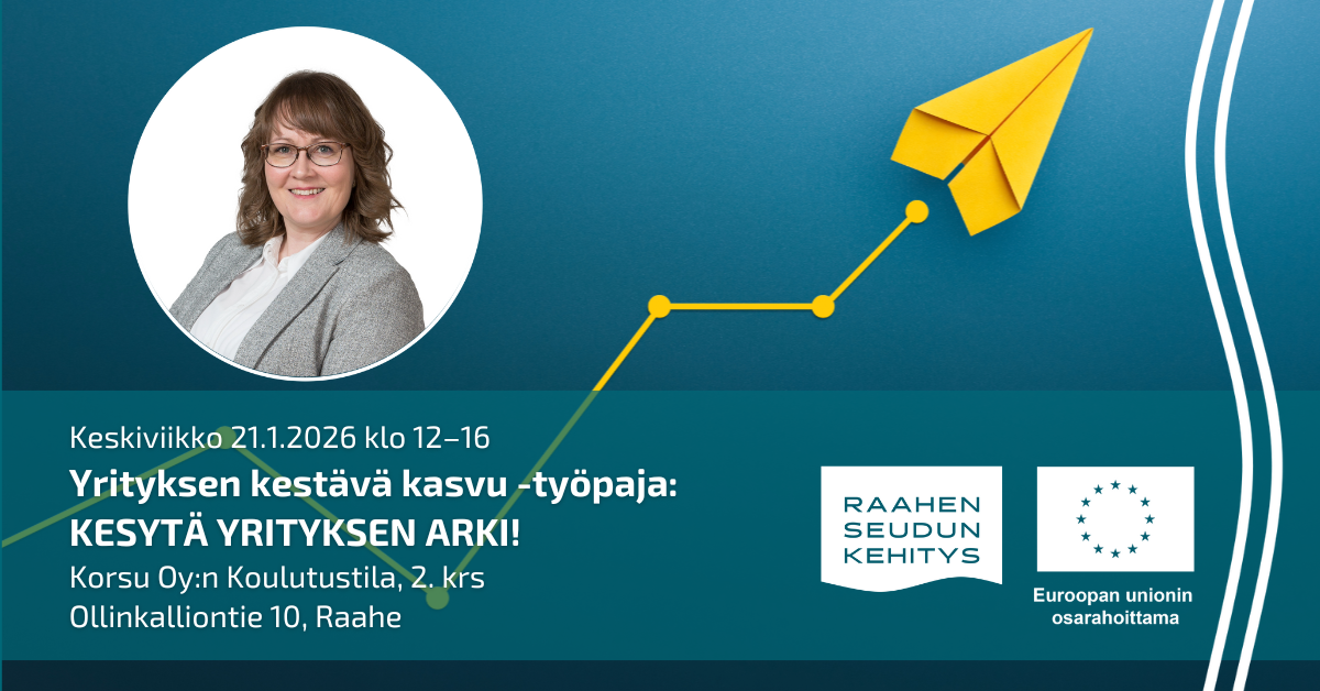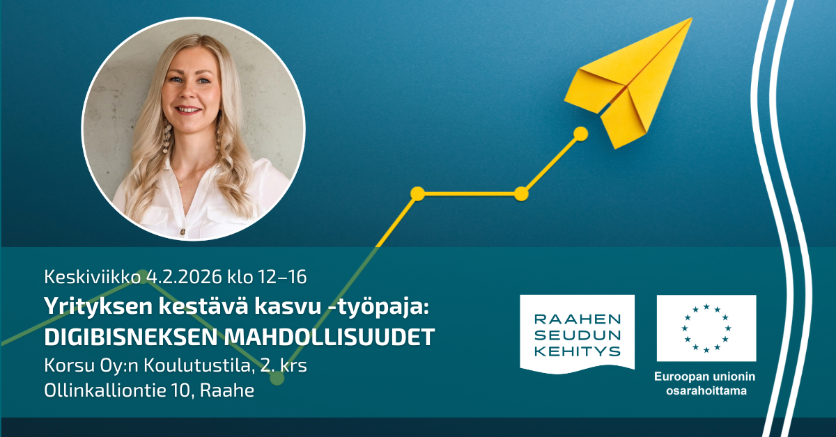 Pyhäjoella tapahtuu YritystapahtumatYrityksen kestävä kasvu työpaja: Kesytä yrityksen arki!01/21/2026 - 12:00 Korsu Oy:n Koulutustila, Ollinkalliontie 10, 92100 Raahe YritystapahtumatYrityksen kestävä kasvu työpaja: Digibisneksen mahdollisuudet02/04/2026 - 12:00 Korsu Oy:n Koulutustila, Ollinkalliontie 10, 92100 Raahe
