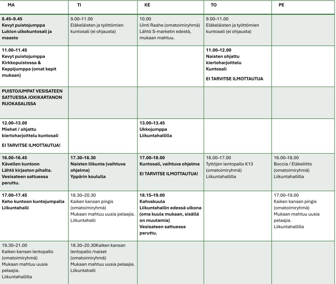 - Tiistaisin klo 17:30-18:30 Naisten liikunta, voimaa, vetreyttä ja kestävyyttä
