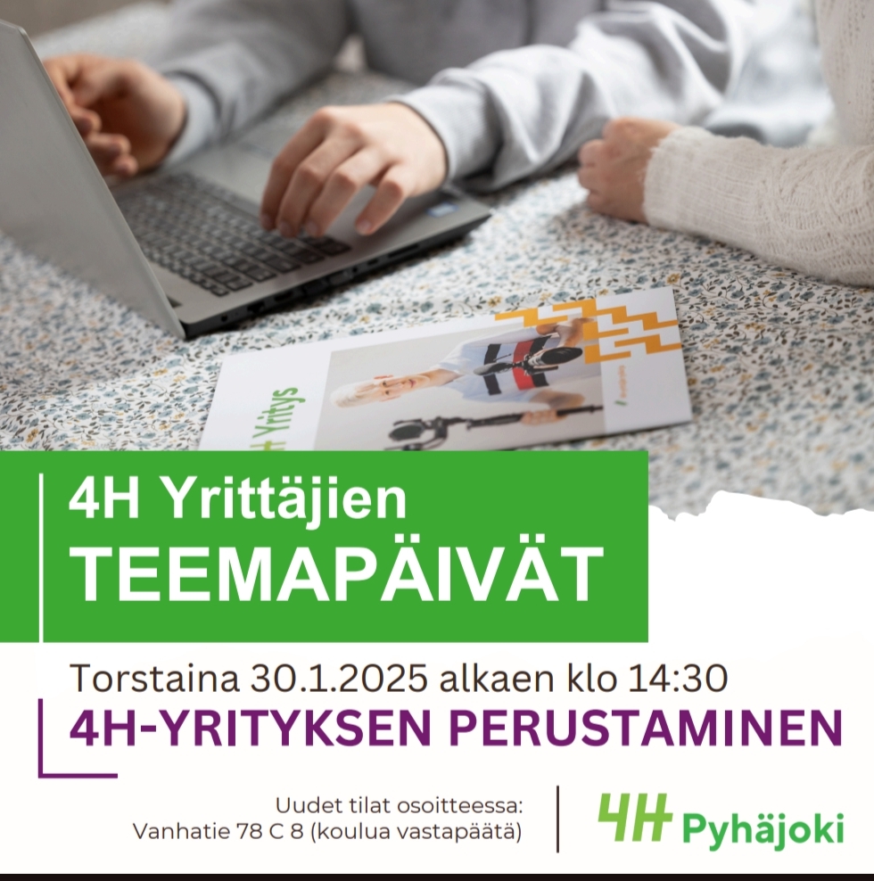 4h- yrittäjille tai yrittäjyydestä haaveileville suunnattu iltapäivä. Ensimmäisen teemapäivän aiheena toimii 4H-yrityksen perustaminen !