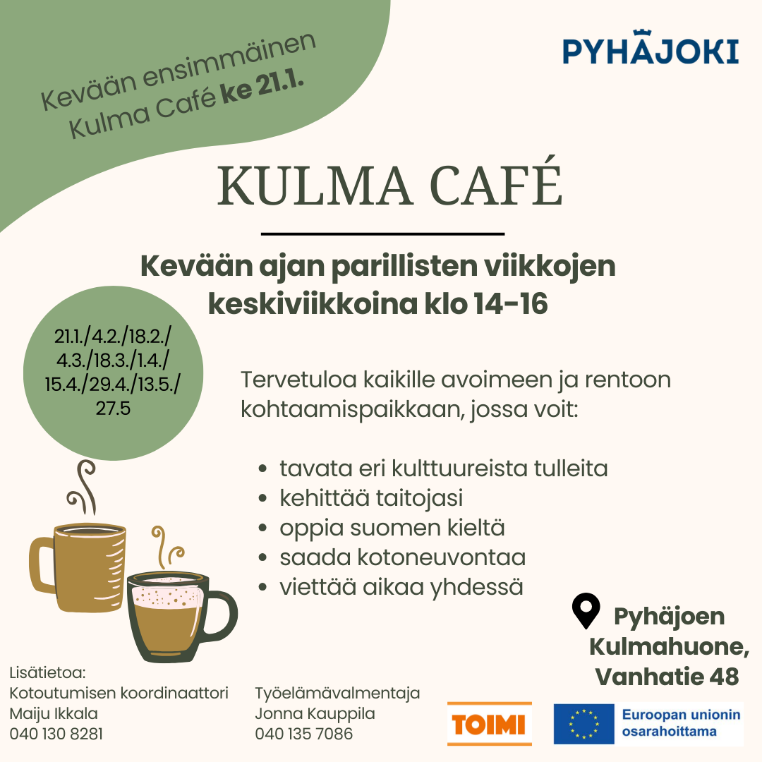 Kulma Café kokoontuu keskiviikkoisin klo 14-16 ja se järjestetään kevään ajan parillisten viikkojen keskiviikkoina: 21.1./4.2./18.2./ 4.3./18.3./1.4./ 15.4./29.4./13.5./27.5